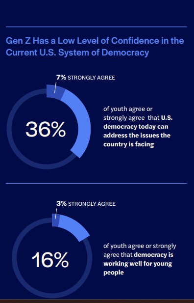 Given their relative resignation about key issues, it is hardly surprising there is lack of enthusiasm for the entire idea of democracy, a governing approach I believe is essential for maintaining the kind of future I hope for. A 2023 survey by the American Public Media Research Lab found that only 27% of Americans aged 18 to 25 strongly agreed that democracy is the best system of government. A subsequent study of young people found that, although there was still support for idea of democracy, belief in the efficacy in the current working of government is anemic, as is their support for any political party.