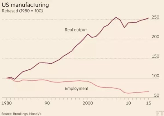 The loss of manufacturing jobs is largely the story of a shift in the technology of production. Society’s desire to explain major changes in terms of specific villains—trade deals and immigrants in this case—is understandable. But all published evidence suggests that, at most, these are smaller factors. The major culprit is automation.