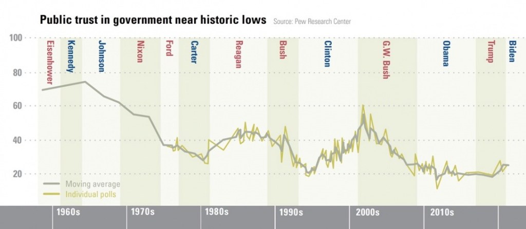 One measure of the degree of support enjoyed by a particular form of government is to ask people how much they trust government to do the right thing. This is not quite a direct evaluation of democracy per se, but it provides an important yard stick of how much people value the current form of government. The Pew Foundation has been studying this issue for years and the results are worrisome.