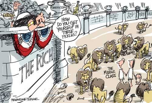 One of the strong sentiments of commentators for the last 100 years is that American democracy is supported by the existence of a strong middle class that feels itself appropriately served by the status quo. Not necessarily the economically richest, but not so far below that that they still feel an ownership stake in the country and not so worried about losing that status that they are overcome by fear. As I suggested in my last post, for democracy to be sustained, a substantial portion of the population must be committed to the idea of democracy. I don’t believe that group can maintain crucial mass unless there is a large middle class and some practical limits on the severity of class divergence.