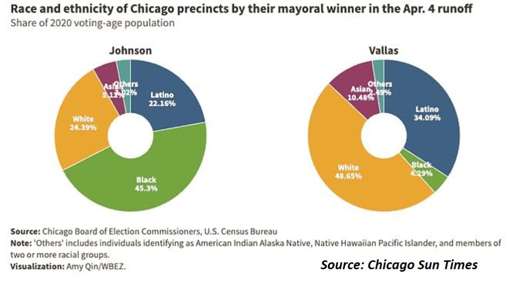 On its surface, the issues around race were unsurprising. Johnson overwhelmingly won the Black vote. Valla won the White vote by equally large margins in the Wards where there are a large number of White voters middle-age or older. But Johnson was very competitive in the wards with younger and more liberal White voters. Likewise, he was able to get a respectable percentage of the Latino vote, although Hispanic turnout was particularly low. Altogether, it was enough for him to put together a two percent win.