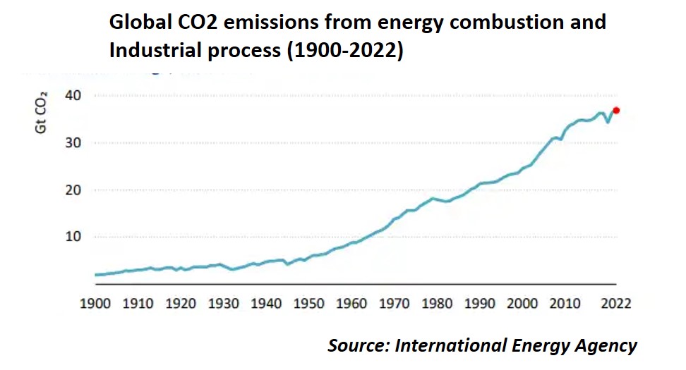 Our relationship with the environment has been endlessly described this summer. But in the back and forth about various catastrophes and specific policies, there is insufficient notice that the world’s use of fossil fuels continues to rise as if nothing unusual were happening. 2022 had the highest global CO2 emissions on record. We had just a small reduction during the early days of the Covid pandemic—which as you may recall brought the global economy to its knees—but it has bounced back pretty much on the same path it’s been on since 1900. Our response to environmental threats doesn’t seem commensurate with the size and complexity of the problem. This is old news. But still not responded to. I don’t believe at this point there is a feasible model for addressing the intertwined causes of the environmental crisis at a reality scale. The political world is divided between those who use the lack of a coherent plan for the future as an excuse to continue our suicidal course and those who don’t want to acknowledge the issue for fear it would jeopardize what immediate gains might be possible.