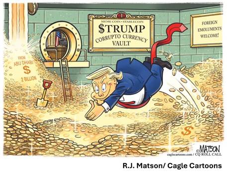 Nor is it all about the president. Crypto spent millions in fifty 2024 Congressional races. The results had the crypto industry boasting that it elected 235 pro-crypto candidates to the House and 16 Senators. One of the organizers of this massive campaign put it this way: “The most important message from this election is that crypto wins.” At the beginning of “Crypto Week” in the House, Fairshake—the main crypto PAC—announced that it already had $141 million ready to invest in the 2026 midterms, a not so subtle warning to those Representatives thinking about straying.