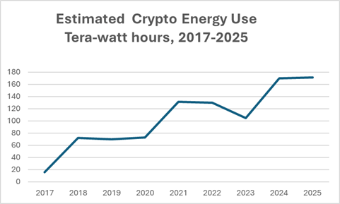 Current world-wide energy devoted to mining cryptocurrencies—“mining” is the technical term for the process by which crypto is validated—is roughly equal to the entire energy consumption of Poland. Initially, most of the crypto mining was in China. But in 2021, citing concerns about fraud, economic instability, and meeting its climate goals, China’s government pulled the plug on decentralized digital currencies. Now the US is the world’s largest crypto mining source, accounting for more than one-third of all such activity. In 2022, the world’s largest facility was in Rockdale, Texas and was reliant on fossil fuel for 96% of its output. The amount of energy consumed there annually is equivalent to the average energy consumption of one million citizens of India.
